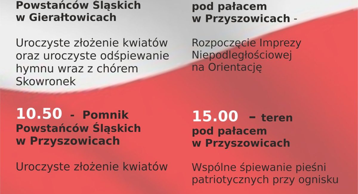 W sobotę, 11 listopada przypada 105 rocznica uzyskania niepodległości przez Polskę. Święto to jest różnie obchodzone w naszym kraju. W Gierałtowicach pod pomnikiem Powstańców Śląskich o godz. 10.15. nastąpi uroczyste wręczenie kwiatów oraz odśpiewanie hymnu wraz z chórem Skowronek. Natomiast w Przyszowicach pod pomnikiem Powstańców Śląskich o godz. 10.50 odbędzie się również uroczyste złożenie kwiatów. Na terenie przy Pałacu w Przyszowicach o godz. 12.00 rozpocznie się Niepodległościowa Impreza na Orientację, także tym w samym miejscu na godz. 15.00 zaplanowano wspólne śpiewanie pieśni patriotycznych przy ognisku.