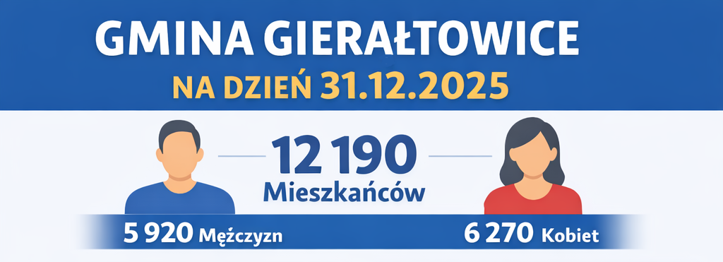 Na dzień 31 grudnia 2025 r. Gminę Gierałtowice zamieszkiwało 12 190 osób, w tym 5 920 mężczyzn oraz 6 270 kobiet.