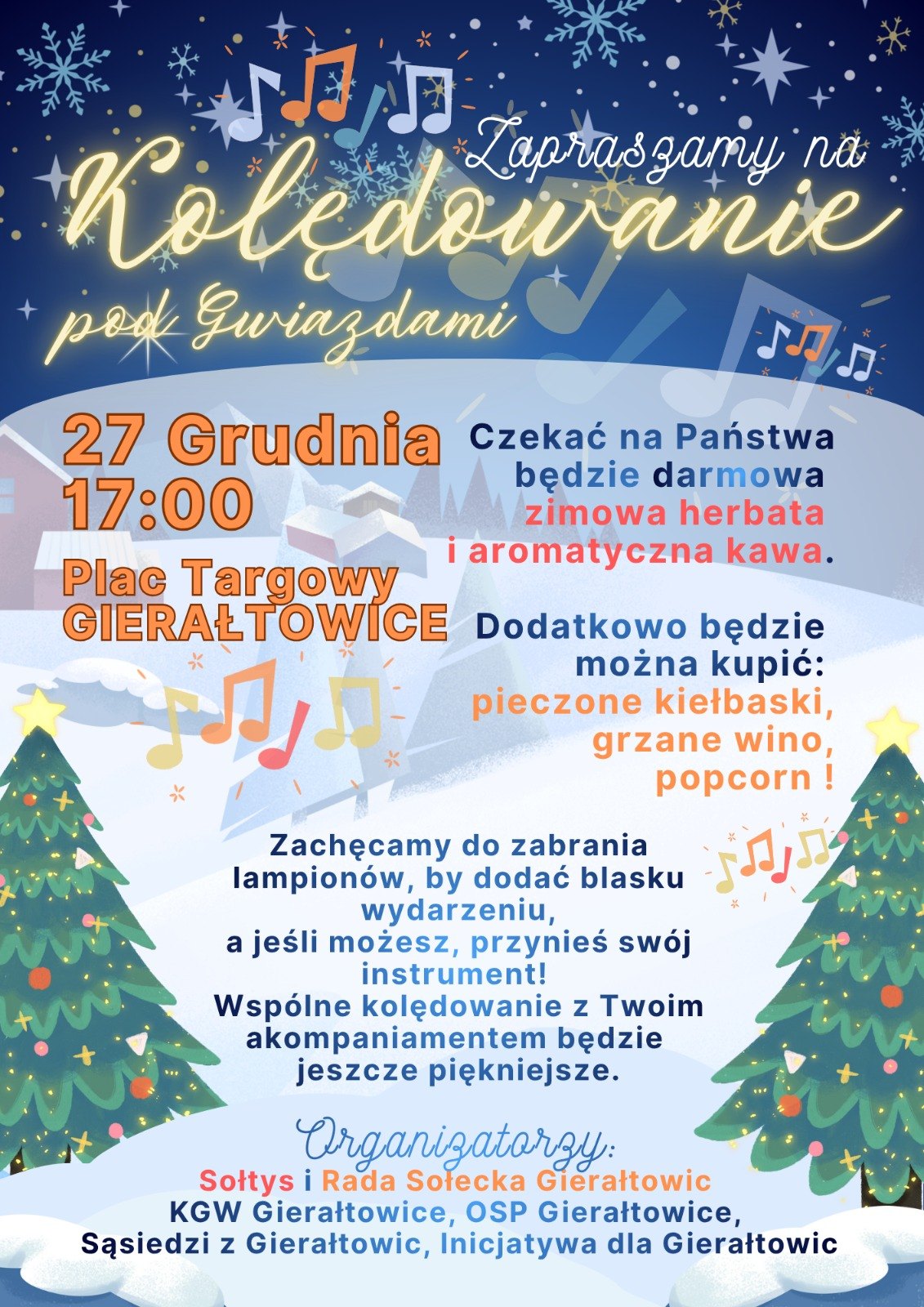 Już 27 grudnia 2025 r. o godzinie 17:00 na Placu Targowym w Gierałtowicach odbędzie się wyjątkowe, świąteczne wydarzenie – „Kolędowanie pod Gwiazdami”. To doskonała okazja, by spotkać się w sąsiedzkim gronie, wspólnie śpiewać kolędy i poczuć magię kończących się świąt.